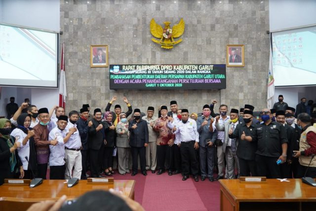 Garut(PI) – Bupati dan Wakil Bupati Garut bersama jajaran DPRD serta perwakilan Forum Masyarakat Garut Utara (Gatra) menghadiri Rapat Paripurna DPRD Kabupaten Garut Masa Sidang lll Tahun Sidang 2020, Kamis (1/10/20). Rapat paripurna digelar dalam rangka pembahasan pembentukan daerah persiapan Kabupaten Garut Utara dengan acara penandatanganan persetujuan bersama.