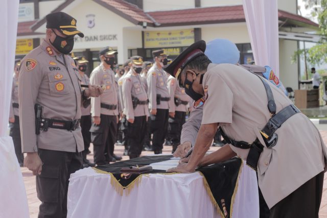 Sumedang-PI. Kapolres AKBP Eko Prasetyo Robbyanto memimpin upacara Serah Terima Jabatan (Sertijab) Kapolsek Darmaraja, Kapolsek Pamulihan, Kasat Lantas, Kasat ResNarkoba, Kasat Reskrim serta Kasi Propam Polres Sumedang di halaman Mapolres Sumedang.Selasa (19/10/21 ).