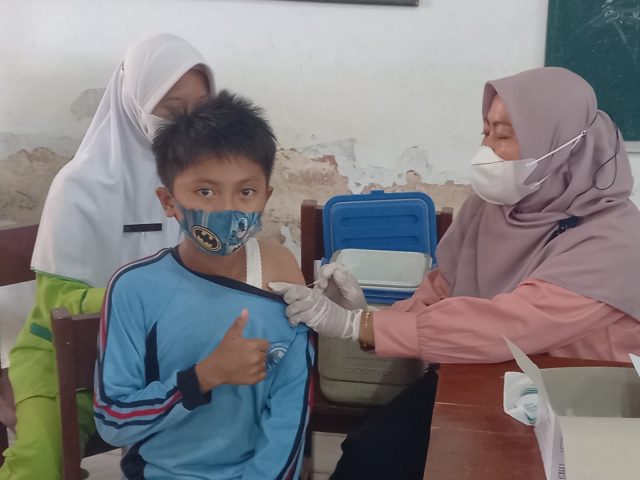 Indramayu-(PI).Kegiatan Vaksin untuk Anak – anak terus digelar agar bisa meningkatkan imunitas tubuh, pada anak anak yang sudah memiliki kekebalan tubuh yang baik.Tim vaksinator dari Upt.Puskesmas Kertasemaya, menggelar vaksinasi di SDN 3 Tulungagung, Kecamatan Kertasemaya, Kabupaten Indramayu Jawa Barat, Sabtu (15/01/2022).