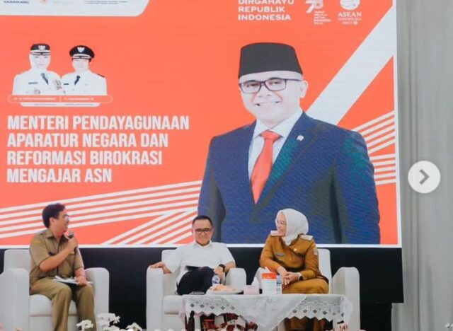 Karawang-(PI). IBupati Karawang dr. Cellica Nurrachadian Mendampingi Menteri Pendayagunaan Aparatur Negara dan Reformasi Birokrasi (PANRB) Abdullah Azwar Anas dalam agenda menyapa dan mengajar aparatur sipil negara (ASN) Kabupaten Karawang Senin 21 Agustus 2023 di Aula Husni Hamid Komplek Pemda Karawang.