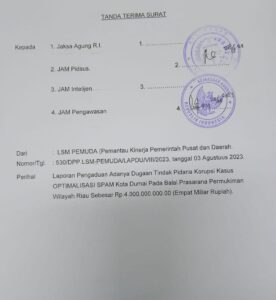 Kota Dumai-(PI). Fernandes Felix Panggabean resmi melaporkan Dugaan tindak pidana Korupsi pada proyek OPTIMALISASI SPAM Kota Dumai Pada Balai Prasarana Pemukimanan Wilayah Riau, dengan NO SURAT 530/DPP/LSM PEMUDA/ LAPDU/ VIII/2023 ke Jaksa Agung Muda bidang Pidana Khusus. , Kamis 3/8/2023