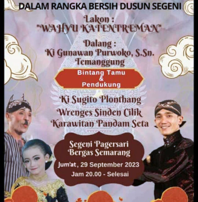 Kab. Semarang (pelitainvestigasi.com) – Dalam rangka memperingati HUT RI ke 78 dan kegiatan rutin bersih desa, kali ini giliran Kp. Segeni RW 01, adakan pagelaran wayang kulit semalam suntuk dengan dalang Ki Gunawan Purwoko, S. Sn dari Temanggung bertempat di halaman desa Pagersari Kec. Bergas Kab. Semarang Jawa Tengah Jumat 29 September 2023 dimulai pukul 20.00 WIB.