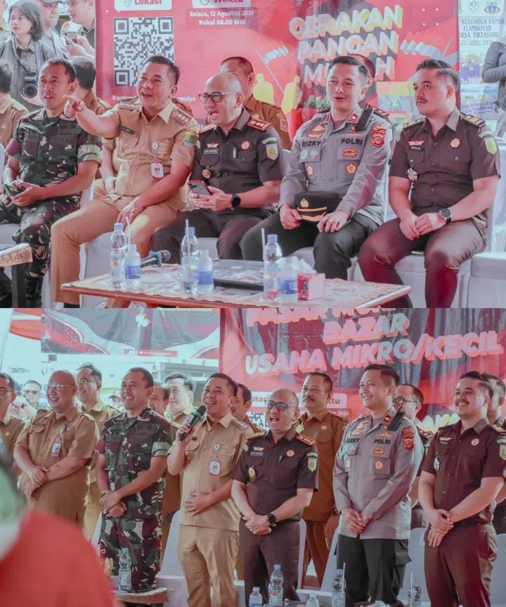 Karawang,-(P). Kejaksaan Negeri (Kejari) Karawang dan Pemerintah Kabupaten (Pemkab) Karawang berkolaborasi dalam menggelar Pasar Murah dan Bazar UMKM dalam rangka memperingati jelang HUT Kemerdekaan RI Ke-80 dan Hari Lahir Kejaksaan RI Ke-80 yang dipadukan dalam kegiatan Gebyar Pelayanan Administrasi Terpadu Kecamatan (Paten) di Halaman Kantor Kecamatan Tirtamulya, Selasa (12/8/2025).