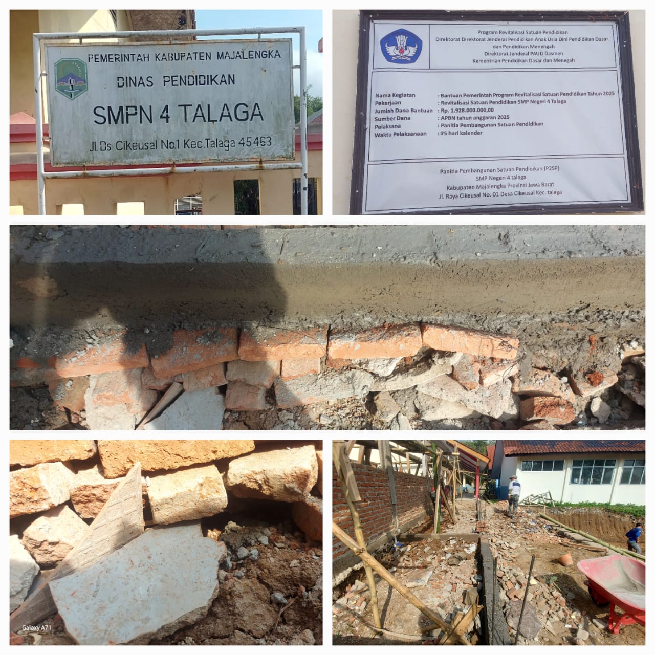 Seperti Kegiatan pembangunan Sekolah Menengah Pertama (SMP) Negeri 4 Talaga Desa Cikeusal Kecamatan Talaga kabupaten Majalengka sudah berjalan beberapa pekan akan tetapi masih banyak para pekerja yang tidak menggunakan Alat Pelindung Diri (APD),Hingga adanya pekerjaan yang tidak sesuai dengan spesifikasi.