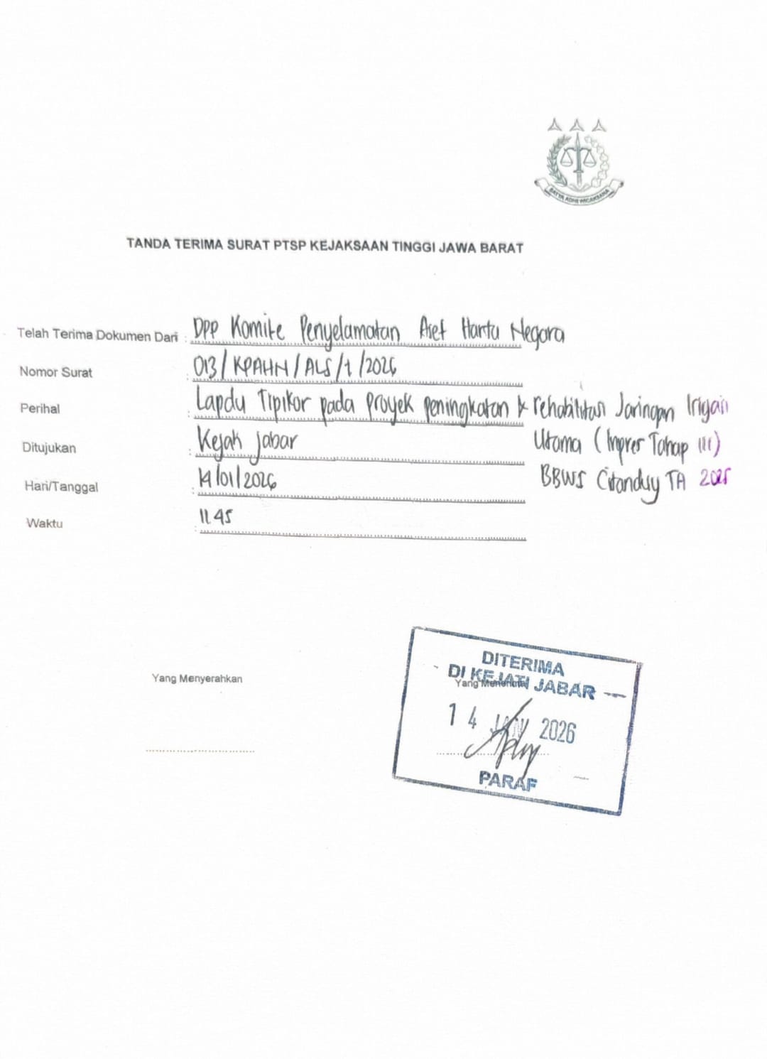 BANDUNG – (PI). Lembaga Swadaya Masyarakat Komite Penyelamatan Aset Harta Negara (LSM KPAHN) resmi melayangkan laporan pengaduan ke Kejaksaan Tinggi (Kejati) Jawa Barat. Laporan ini berkaitan dengan dugaan tindak pidana korupsi pada proyek Rehabilitasi Jaringan Irigasi Utama di bawah wewenang BBWS Citanduy (Inpres Tahap III).