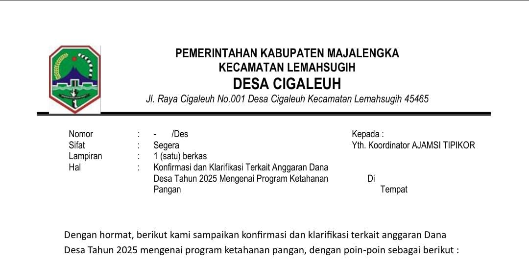Majalengka-(PI ). 26 Februari 2026 Peternakan ayam petelur yang didirikan di Desa Cigaleuh Kecamatan Lemahsugih kabupaten Majalengka menggunakan dana desa bidang ketahanan pangan menjadi sorotan setelah ditemukan tidak sesuai dengan persyaratan perizinan dan spesifikasi teknis. Meskipun Kepala Desa melalui konfirmasi tertulis menyatakan bahwa semua telah dilakukan sesuai prosedur, hasil pemeriksaan di lapangan menunjukkan kondisi yang jauh dari sempurna dengan dugaan tidak matangnya perencanaan program tersebut. Selain itu, balasan awal dari desa terhadap surat konfirmasi resmi Aliansi Jurnalis Advokat LBH LSM Ormas (Ajamsi) Tipikor dinyatakan tidak sah karena tidak ditandatangani Kepala Desa dan tidak sesuai dengan subtansi permintaan.