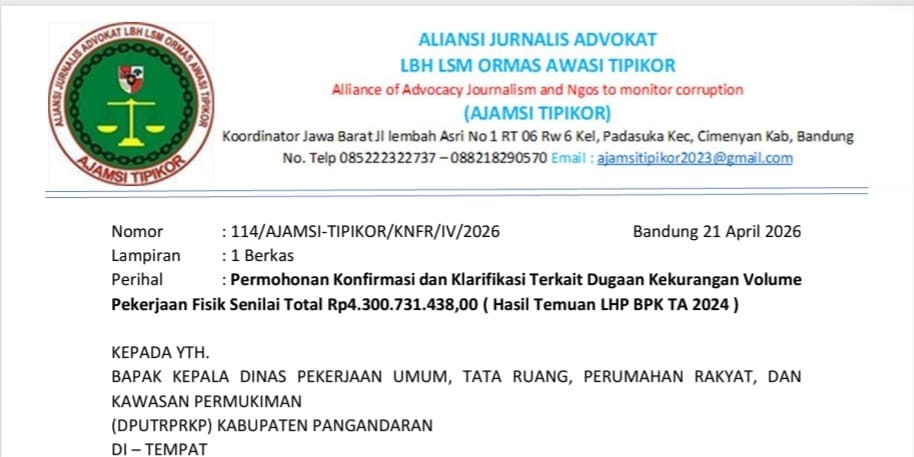 Untuk mengonfirmasi temuan tersebut, Aliansi AJAMSI Tipikor telah mengirimkan surat resmi nomor: 114/AJAMSI-TIPIKOR/KNFR/IV/2026 pada hari Rabu, 22 April 2026 kepada pihak DPUTRPRKP Kabupaten Pangandaran.