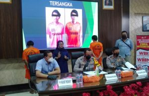 SUMEDANG-(PI).Dua orang tersangka tindak pidana kekerasan di muka umum NM (29) dan US (22) tertunduk lesu saat dibawa ke ruangan Aula Tribrata Polres Sumedang...